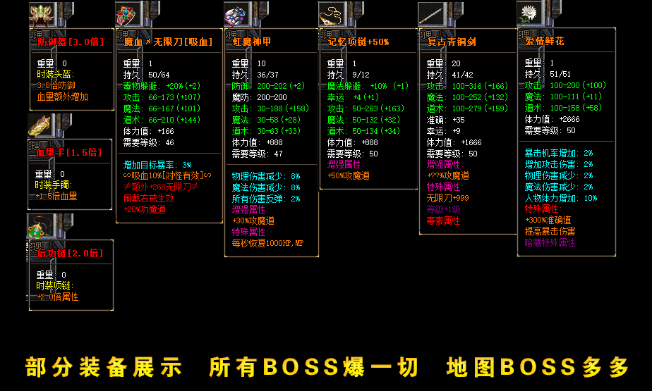地图多多,每图内BOSS多多,穿戴鉴定极品,最高+166.